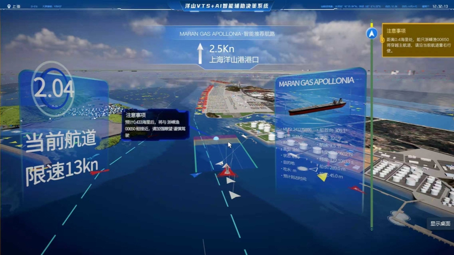 10时15分,“阿波罗尼亚”轮航经黄泽洋灯船,进入洋山港主航道。在其进港全程,洋山港海事局自主研发的人工智能系统“VTS精灵”开启实时智慧导航模式,通过整合多源数据、智能感知航行环境、自动生成航行建议,为船舶提供从航路选择、航速调整到风险预警的全链条数字化导航支持,实现了对重点船舶的全程、动态、精准监护。