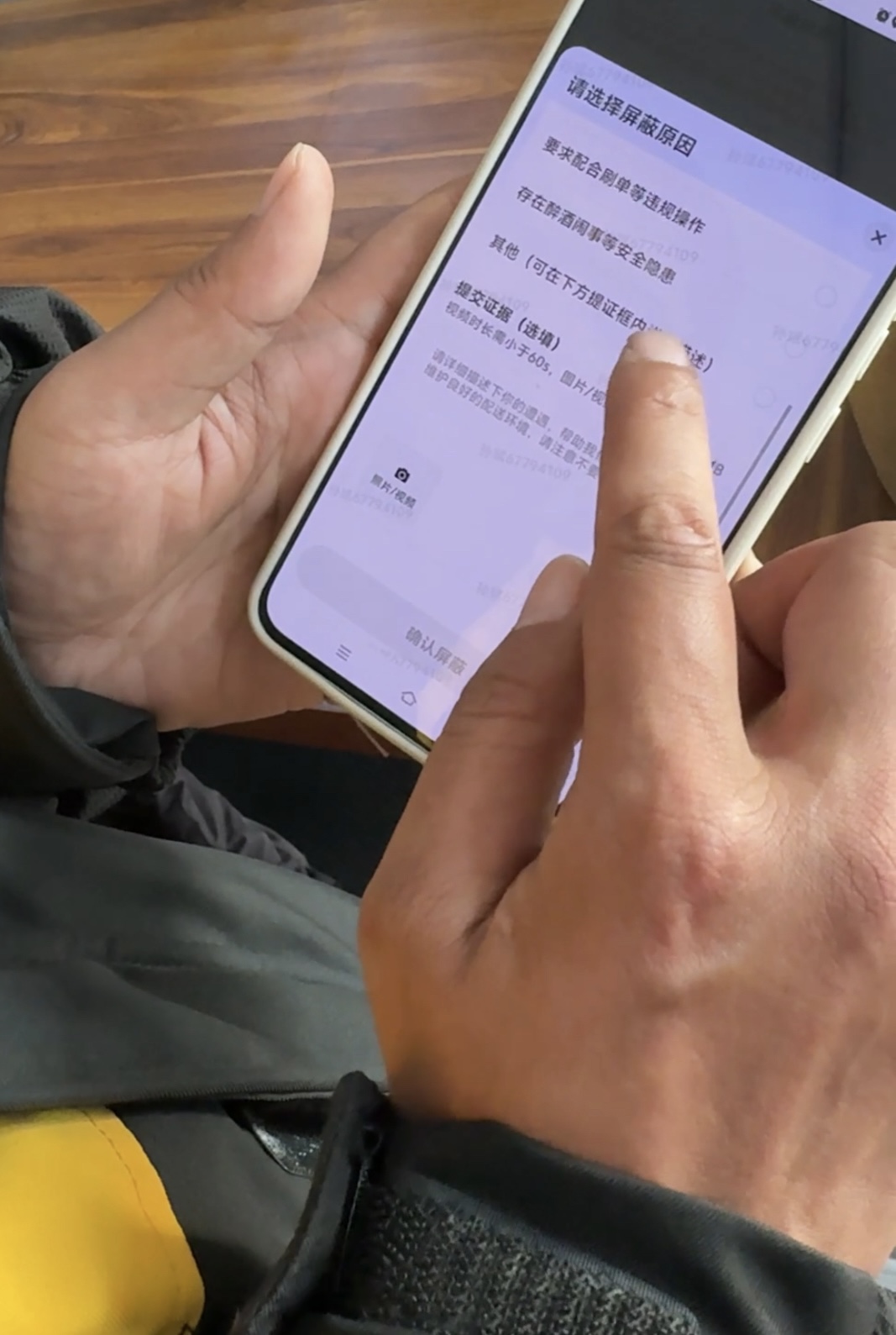 孙斌告诉记者,骑手需要提交屏蔽原因。常见的屏蔽原因有:顾客要求骑手捎带垃圾并威胁投诉、辱骂骚扰或不尊重骑手、索要骑手信息侵犯隐私等等,骑手还可以上传图片、视频等证据。