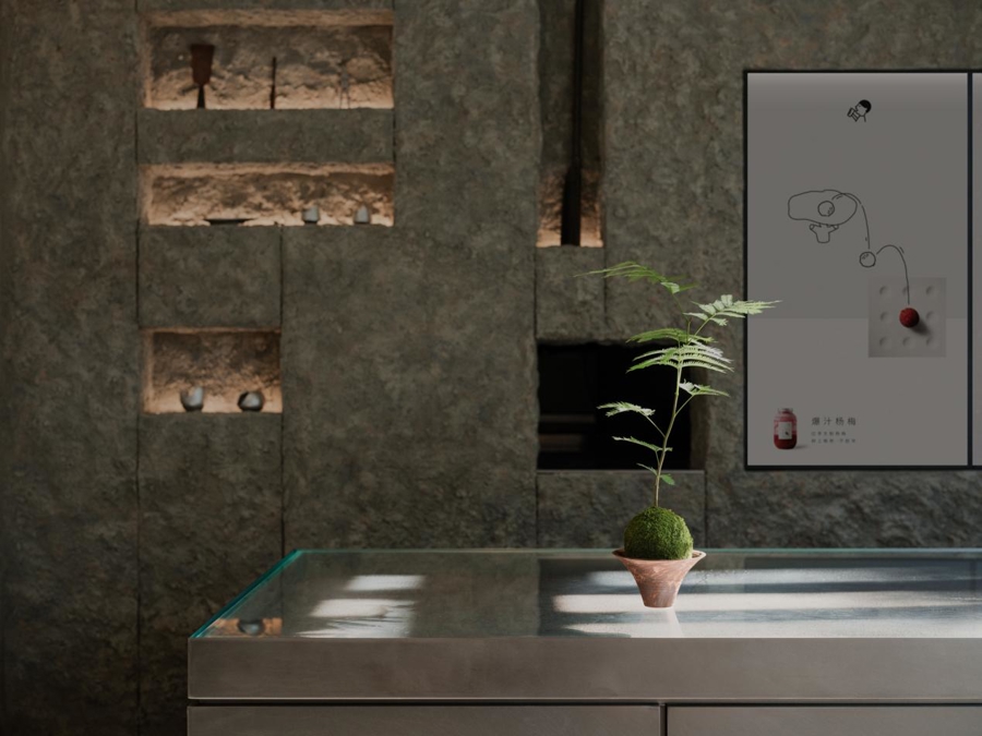 空间内的点茶吧台采用透明台面,完整显露出台面下方如同烧水煮茶时留下的煤渣印记。空间墙面上,喜茶空间设计团队将收集来的铜壶、茶器标本与喜茶门店在用的龙井茶叶嵌入墙体,形成一面茶文化“考古墙”,门店入口处的考古墙上,喜茶还埋入了一枚“阿喜古币”作为彩蛋,用过去为未来提供信息。